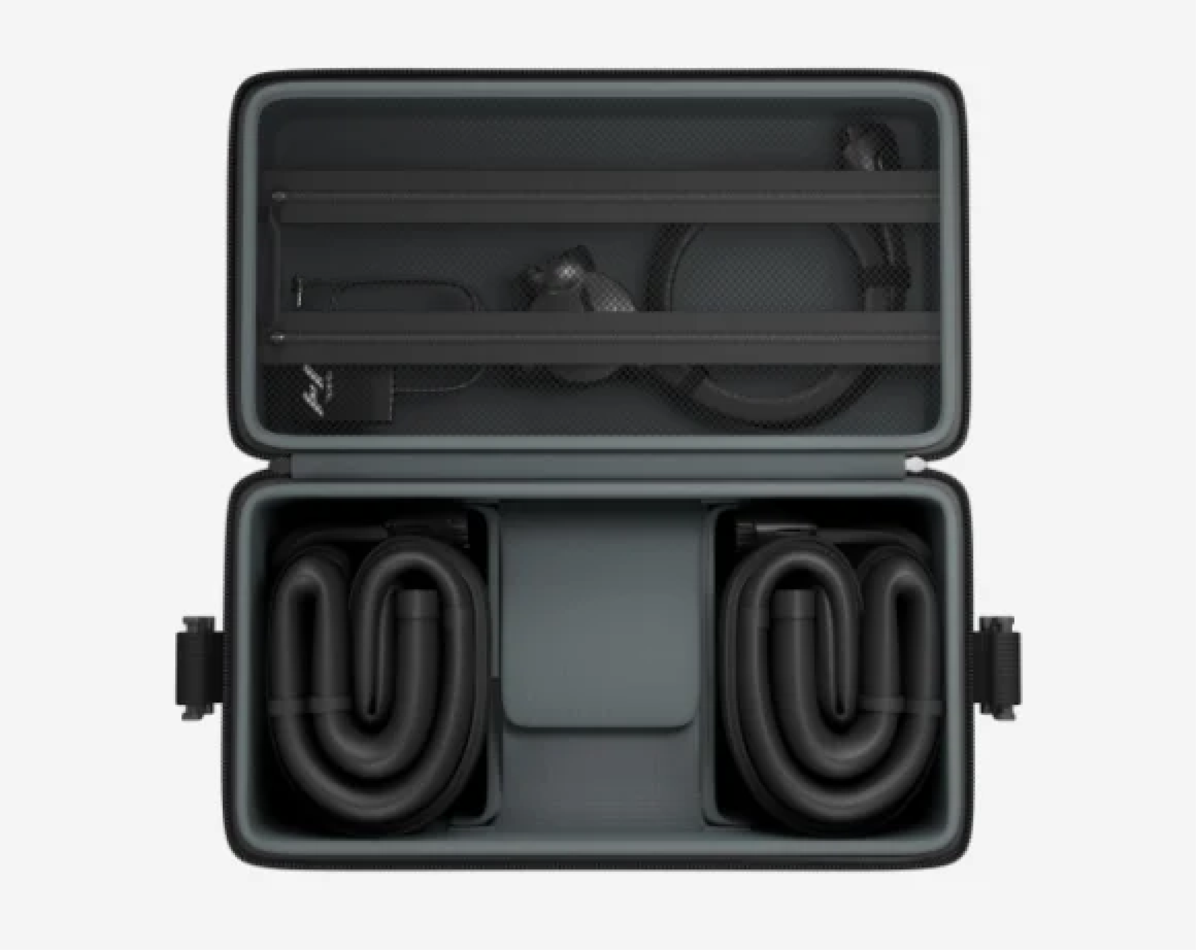 A mesh zippered compartment in the lid conveniently carries your hoses and power supplies, while the padded cells protect your device and store attachments safely.